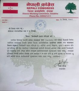 दोलखा, वैशाख ११ – नेपाली कांग्रेस जिल्ला कार्यसमिति, दोलखाले संगठनप्रतिको दीर्घकालीन समर्पण, पार्टी सिद्धान्तप्रति दृढ निष्ठा, तथा यातायात क्षेत्रमा सक्रिय योगदानलाई उच्च सम्मान गर्दै श्री तिलक थापा लाई आमन्त्रित जिल्ला सदस्य तथा यातायात विभाग प्रमुख पदमा नियुक्त गरेको छ।
